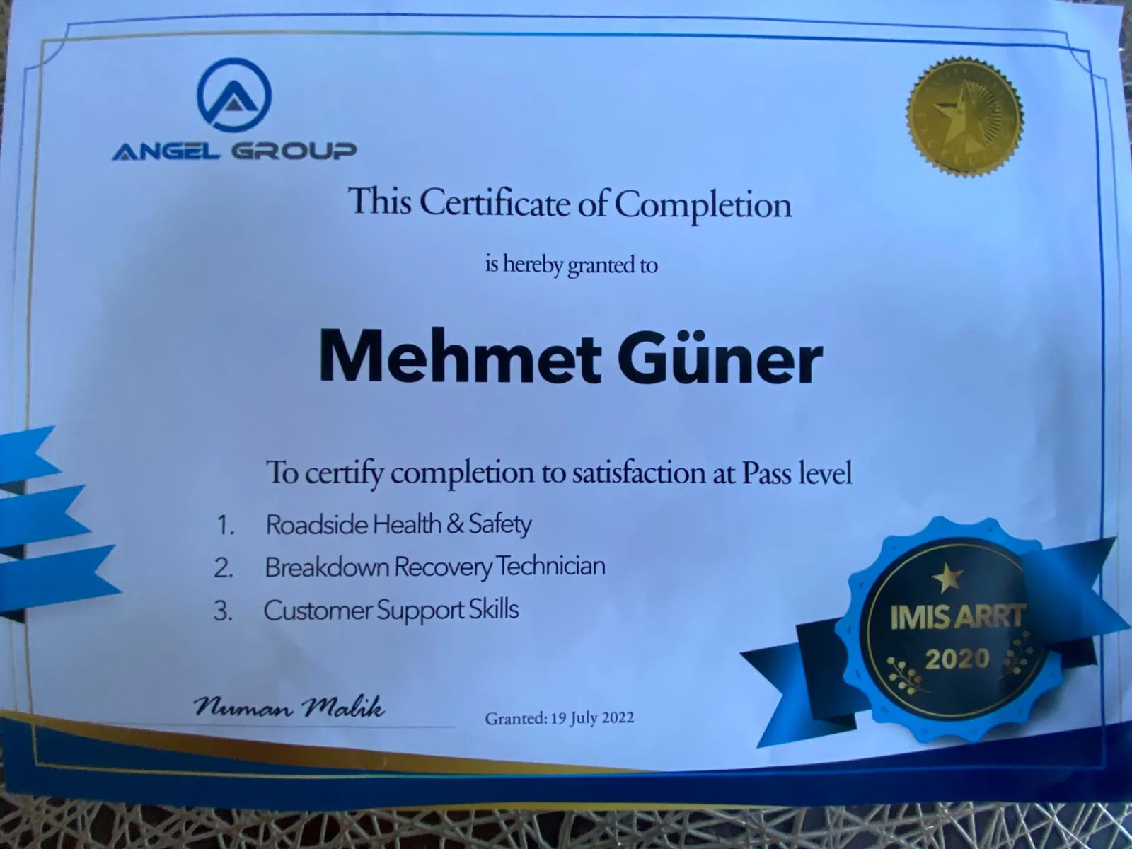 Comprehensive training certification covering three key areas: Roadside Health & Safety, Breakdown Recovery Technician, and Customer Support Skills. Demonstrates practical competency in automotive recovery and roadside assistance services.